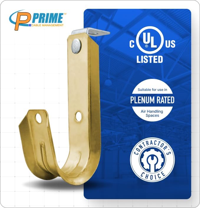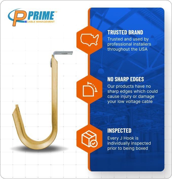 - Most popular non-continuous cable support J-Hook. Allows for easy access, upgradable cable runs without the use of conduit or trays. A wide beveled base, when spaced correctly (recommended up to 5’) minimizes creation of pressure points or kinks. cULus Listed & TIA compliant.